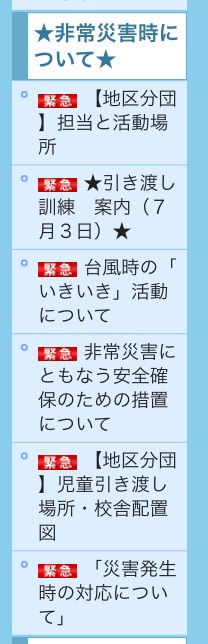 学校ホームページ右欄【★非常災害時について★】に、「地区分団」担当と引き渡し場所を載せています。ご確認ください。
