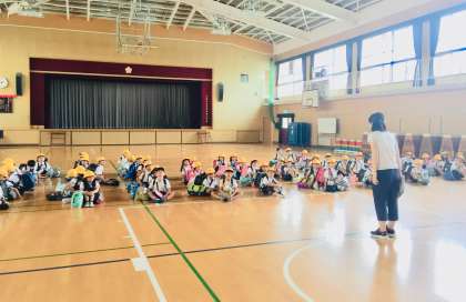 1年生が講堂に集合して、6年生のリーダーが迎えに来てくれるのを待っています。
