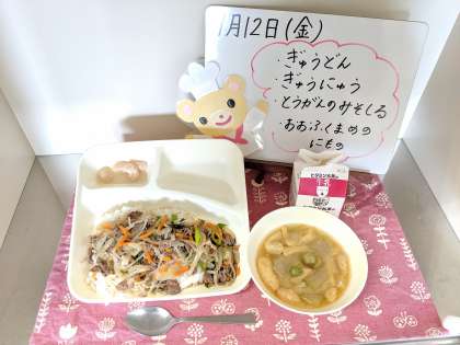 今日の給食は、牛丼、牛乳、とうがんのみそ汁、大福豆の煮物です。