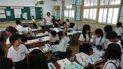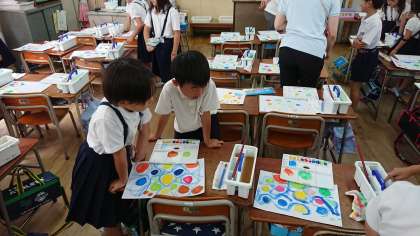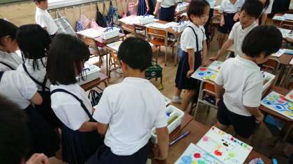 友達が描いた「シャボン玉」をお互いに鑑賞しています。
