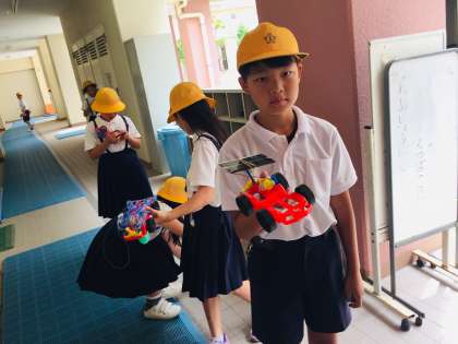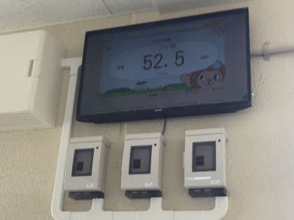 4年生は一学期に、太陽光エネルギーの流れ学習をしました。講堂の屋根に、ソーラーパネルを設置しています。多目的室前のモニターで太陽光発電の状況を見ることができます。
