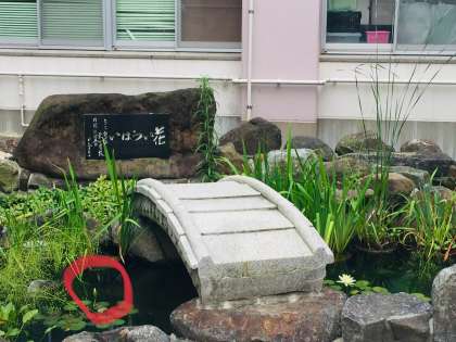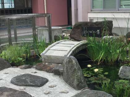 のびのび広場の池に、ハスが咲いています。つぼみもあります。