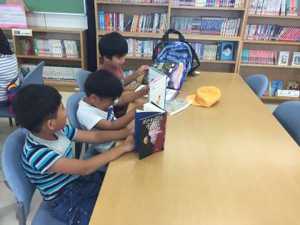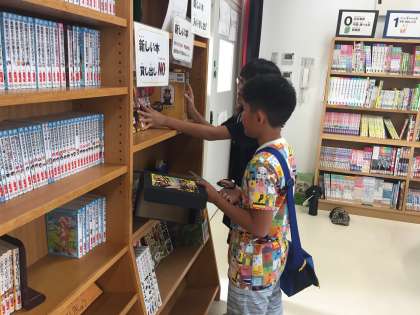 今日の図書館開放で、児童が読書を楽しんでいる様子です。プール開放の前後に参加している児童がいました。児童の図書委員さんも活動していました。