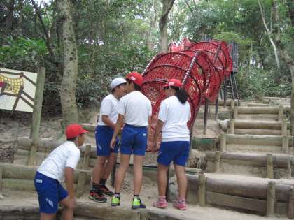 今日は、5年生が遠足で、「須磨離宮公園」に行ってきました。子供の森の冒険コースで、楽しく過ごしました。ここは、緑豊かな中で体力づくりをしながら森林や自然の雰囲気を肌で実感できる場所です。「宝島に宝探しをしに行こう」ということで、どんどんと難関をクリアしていきました。
