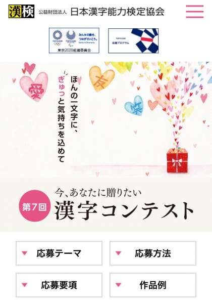 日本漢字能力検定協会主催の「第7回漢字コンテスト」の案内です。個人応募してください。詳しくは、こちらをご覧ください。→ https://www.kanken.or.jp/kanjicontest2019/