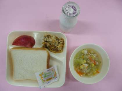 今日の献立は「なすのミートグラタン、野菜のスープ、りんご」でした。