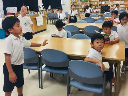 図書の時間の様子です。学校図書館には、英語の本が50冊以上あります。夏休みの間に、学校図書館補助員の方が、英語の本の整備をしてくださいました。