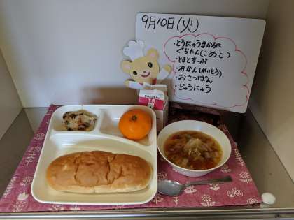 今日の給食は、おさつパン、牛乳、豆乳マカロニグラタン(米粉)、トマトスープ、冷凍みかんです。