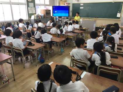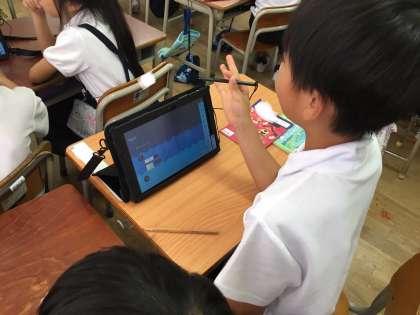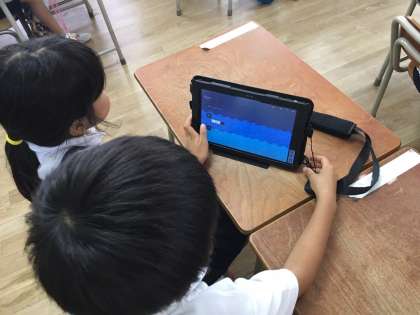 今日は、1年生で小学校で初めてのプログラミングの学習をしました。タブレットを使い星が動くようにプログラムし、流れ星を作りました。