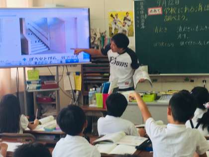 学校にある消防せつびについて、学んでいます。教育実習生も授業に参加していました。