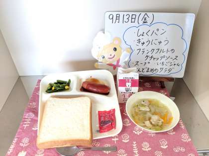 今日の給食は、食パン、いちごジャム、牛乳、フランクフルトのケチャップソース、スープ、さんどまめとコーンのサラダです。