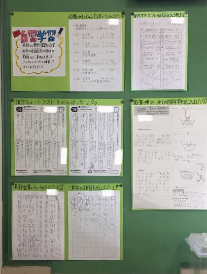 教室の掲示板で、家庭学習の紹介をしています。学習学習の習かんを大切にしましょう。