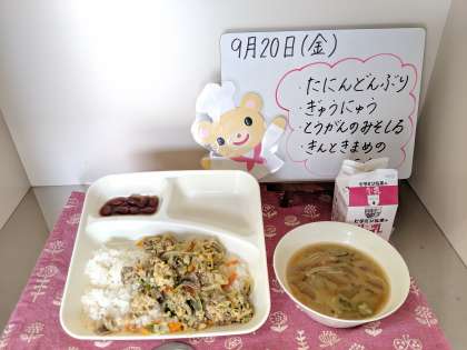 今日の給食は、他人丼、牛乳、とうがんのみそ汁、金時豆の煮ものです。