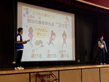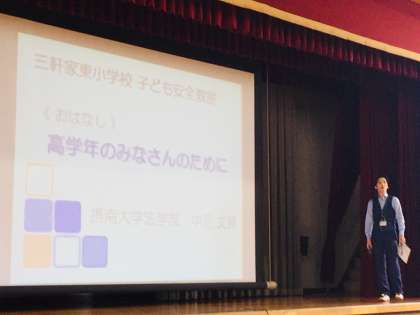 摂南大学 法学部の中沼丈晃(たけあき)教授と「子どもの安全まもるんジャー」の方に、「子ども安全見守り教室」をしていただきました。