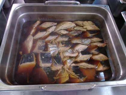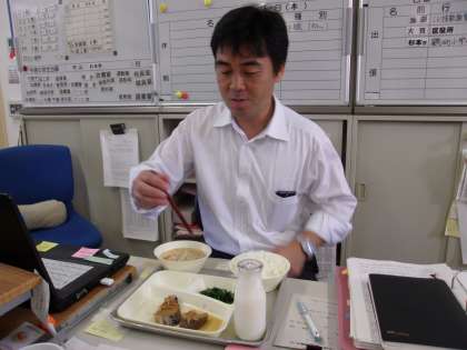 なまりぶしは、かつおの身をおろした後に煮て、冷まし、骨を抜いて作ったものです。ご飯によくあい、とてもおいしかったです。児童の安全のため、毎日児童が食べる30分前には教頭先生が検食をしています。