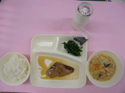 今日の献立は「なまりぶしのしょうが煮、みそにゅうめん、ほうれん草のおひたし」でした。
