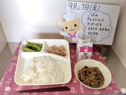 今日の給食は、ごはん、牛乳、マーボーなす、もやしのごま酢あえ、えだまめです。