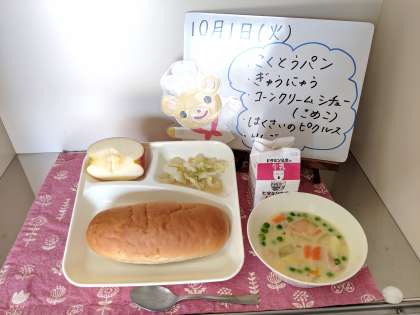 黒糖パン、牛乳、コーンクリームシチュー(こめこ)、はくさいのピクルス、りんごです。