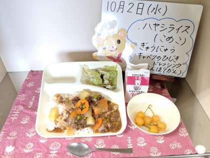 今日の給食は、ハヤシライス(米粉)、牛乳、キャベツのひじきドレッシング、さくらんぼ(缶)です。