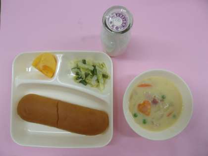 今日の献立は「コーンクリームシチュー(米粉)、キャベツと三度豆のサラダ、かき(平核無柿 ひらたねなしがき)」でした。