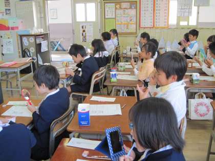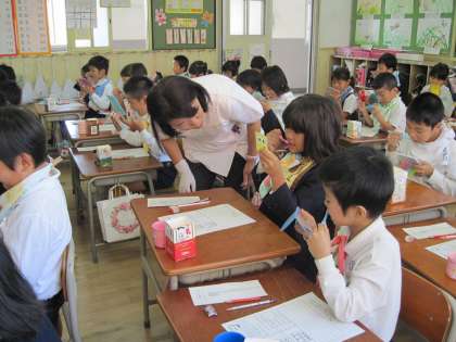 歯科衛生士さんに来ていただき、「正しい歯のみがき方」について学習しました。「歯の染め出し」をして、みがき残しのある場所を鏡を見て確認しました。その後、もう一度鏡を見て、一生懸命みがきました。1本1本丁寧にみがくことが大切であることを知りました。「歯の裏がつるつるになった!」とうれしそうでした。