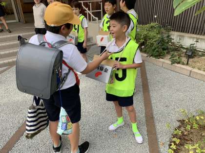 今週は、あいさつ週間です。代表委員会と運営児童会が赤い羽根募金の呼びかけを18日(金)まで行います。