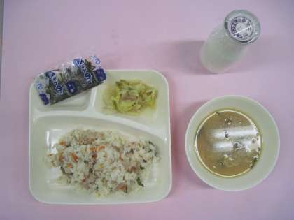 今日の献立は「かやくご飯、みそ汁、はくさいのゆず風味」でした。