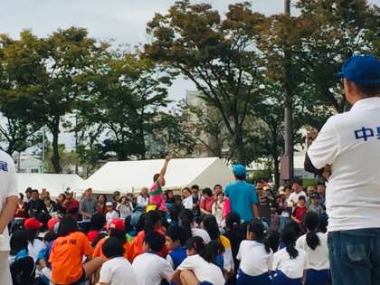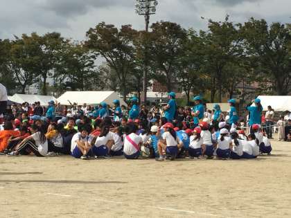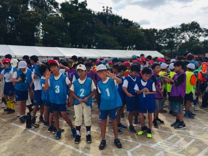 ミニ運動会(小学校地域対抗男子リレー)の様子です。大正区長 吉田康人さんの出発の合図で、リレーが始まりました。