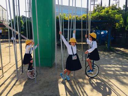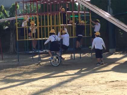 登校後、運動場で元気に遊んでいます。一輪車で運動している児童もいます。