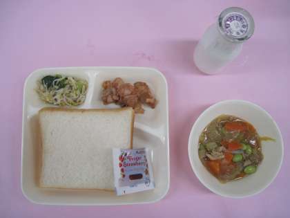 今日の献立は「鶏肉のチリソース焼き、中華煮、甘酢あえ」でした。