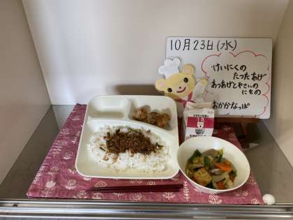 今日の給食は、ごはん、牛乳、鶏肉のたつたあげ、あつあげと野菜の煮物、おかかなっ葉です。