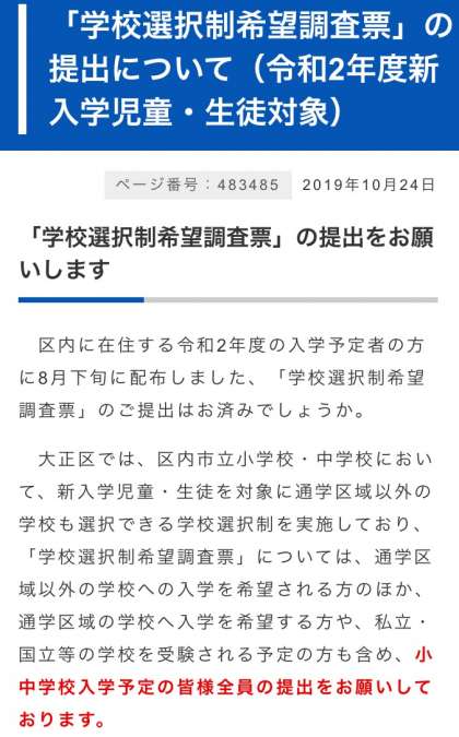 「学校選択制希望調査票」の提出について(令和2年度 新入学児童・生徒対象)