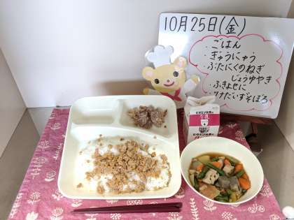 今日の給食は、ごはん、牛乳、豚肉のねぎじょうゆ焼き、ふきよせ煮、ツナ大豆そぼろです。