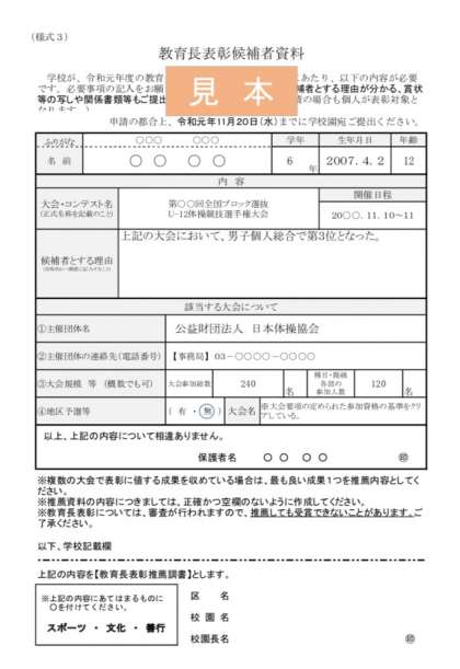 さて、大阪市教育委員会では、大阪市教育委員会表彰規則に基づき、今年度の幼児・児童・生徒の文化活動、体育・スポーツ活動及び人命救助等の善行において、顕著な成果をおさめた幼児・児童・生徒や功労のあった幼児・児童・生徒について教育長表彰を行います。つきましては、次の基準に該当する幼児・児童・生徒がいる保護者におかれましては、別添の教育長表彰候補者資料(様式3)を作成し学校宛ご提出ください。
