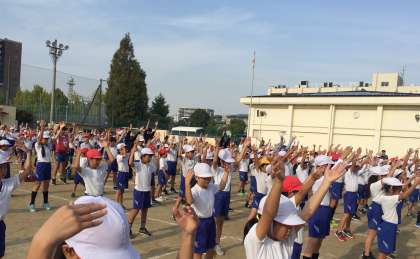 ルール説明の後、準備運動(ラジオ体操)をしました。