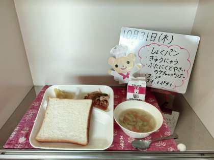 今日の給食は、食パン、牛乳、豚肉と野菜のケチャップソテー、スープ、スイートポテト、ソフトマーガリンです。