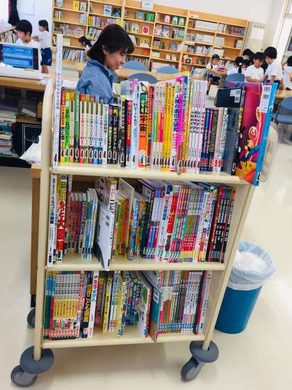 新しい本がたくさん入りました。毎週金曜日に来ていただいている学校図書館補助員の今岡さんが、本の整理をしてくださっています。