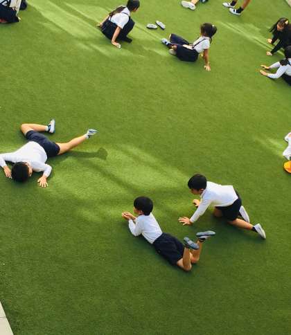 のびのび広場でリラックスしています。のびのび広場は、140周年記念に地域の方に人工芝をしいていただきましたが、地面はかたいですので、ゆっくりと安全にすごしましょう。