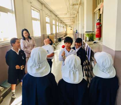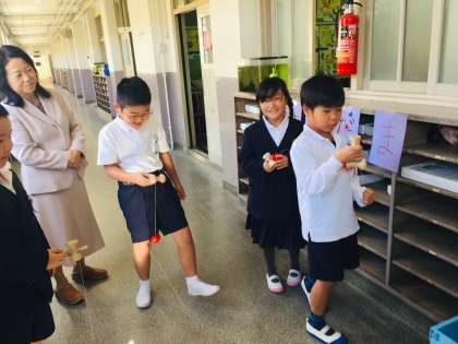 1年生が三軒家西幼稚園の年長さんと交流をしました。「けん玉あそび」や「どんぐりゴマ回し」を優しく教えていました。