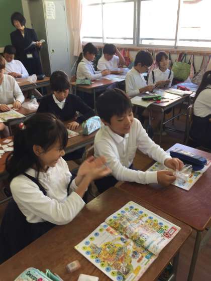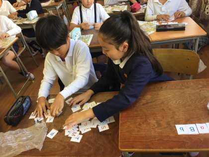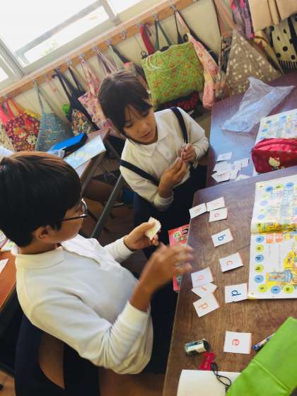 活動の様子です。となりの席の友だちと大文字と小文字のマッチングをしています。