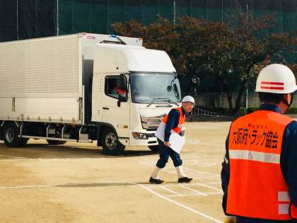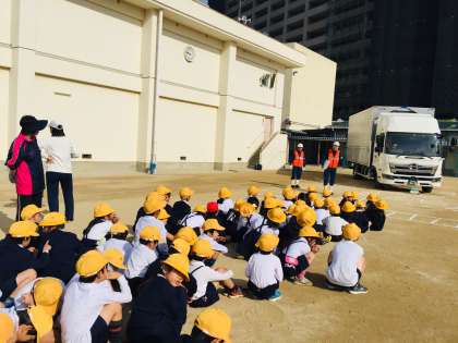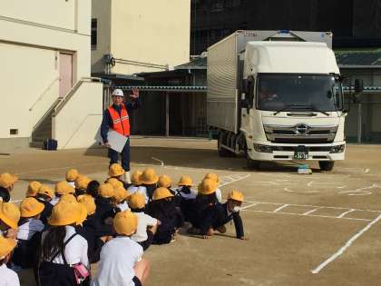 安全な歩行について、学習しました。大阪トラック協会の方に来ていただき、運転手から見えない死角について教えていただきました。