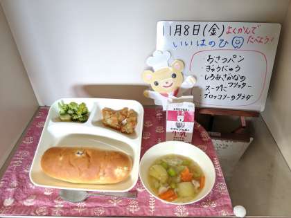 今日の給食は、おさつパン、牛乳、白身魚のフリッター、スープ煮、ブロッコリーのサラダです。