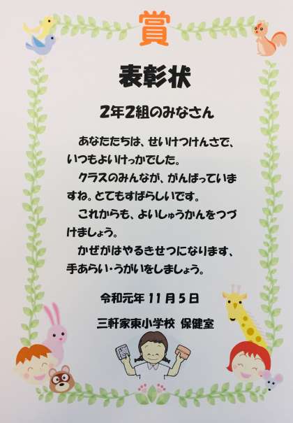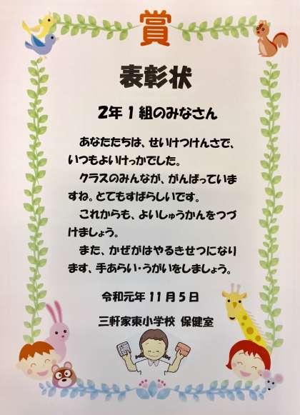 保健指導では、毎週火曜日に行っている清潔検査の結果をもとに「ハンカチ・ティッシュの携帯と爪切り」の指導をしています。結果の良かった学級には、表彰状を渡しました。