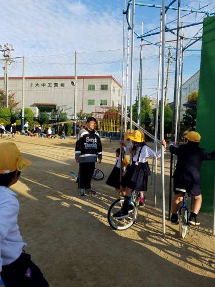 先生の凄い技を見て、子どもたちも大喜びでした。定期的にご指導頂く予定です。みんな、一輪車が、上手くなれば良いね。