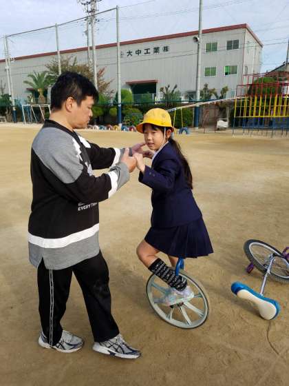 昨日、いきいきに「日本一輪車協会」の辻先生にお越しいただき、子どもたちに一輪車の乗り方のご指導をしていただきました。