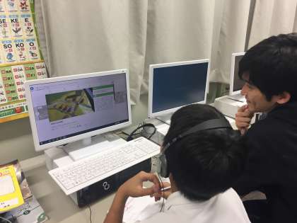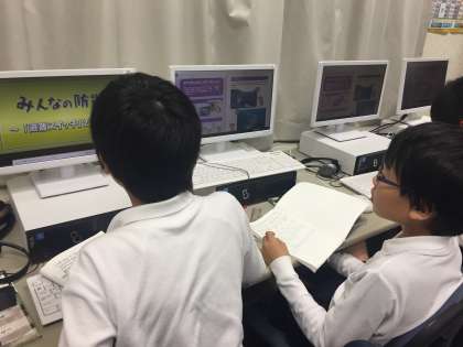 パソコンを使って、川の災害や災害を防ぐための工夫について調べました。NHK for school を見ている児童もいます。