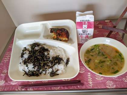 今日の給食は、ごはん、牛乳、千草焼き、みそ汁、ごまひじきです。