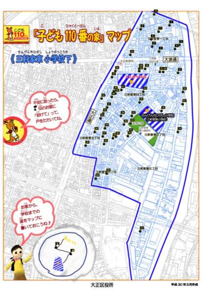 「三軒家東地域 子ども110番の家マップ」は、学校ホームページの右欄【安全・安心のために】にアップしています。PDF版は、こちらです。→