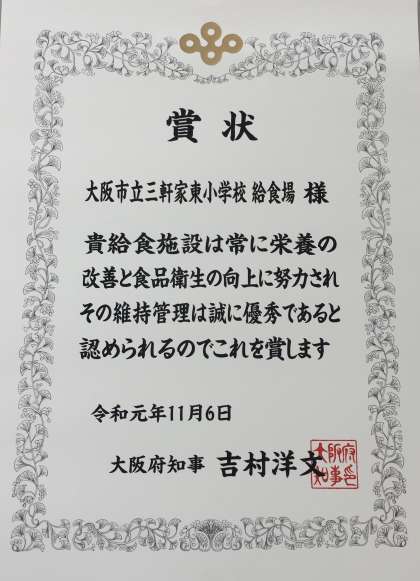 給食室が大阪府から表彰されました。