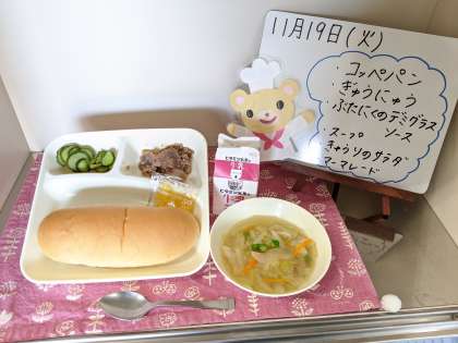 今日の給食は、コッペパン、牛乳、豚肉のデミグラスソース、スープ、きゅうりのサラダ、マーマレードです。